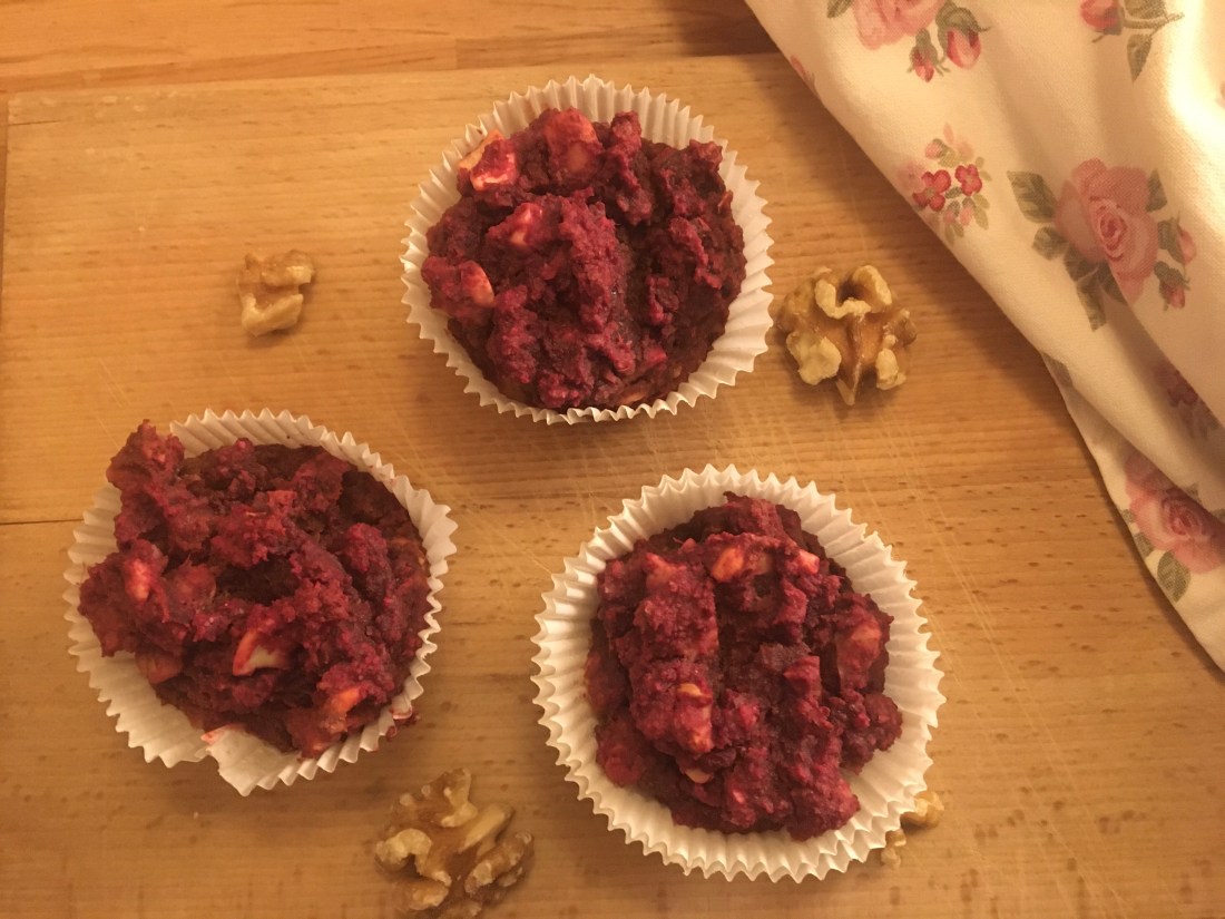 3 EL Haferflocken, 100 g gemahlene Mandeln, 1 TL Zimt, 1/2 TL Kardamom, 2 TL Backpulver 1 Handvoll gehackter Walnüsse ( Baumnüsse) und 1 Handvoll Cashewkerne, 1 Tasse Soyamilch ( Kuhmilch) und 1 EL Agaven Dicksaft vermengen und in die Muffinförmchen verteilen.
