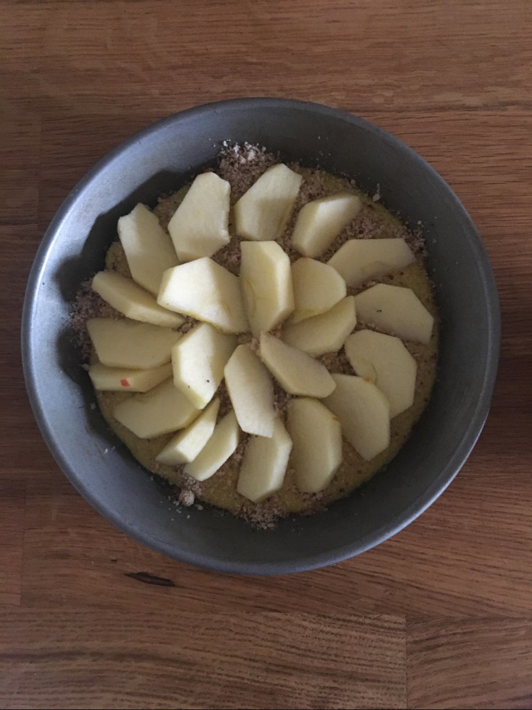 Schneide Apfelschnitzchen lege sie in einem schönen Muster auf die Mandeln