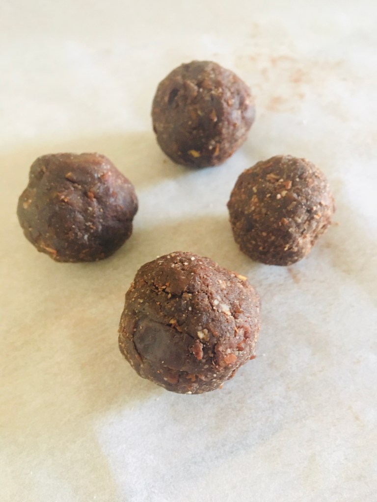 Zutaten: 250g ungeschälte, weiche Datteln, 1 gehäufter TL Kakao ungesüsst, 1 EL gemahlene Mandeln, 1 TL Zimt