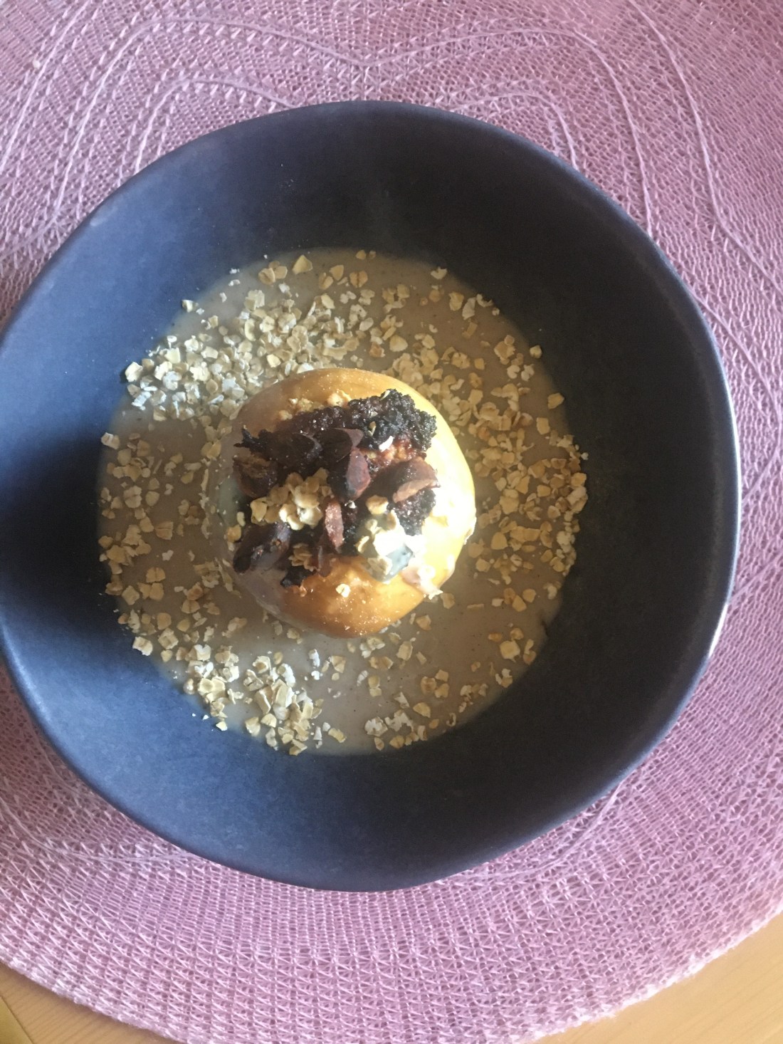 In einem Suppenteller die Früchte präsentieren und die Vanillesauce darum herum verteilen und mit den Haferflocken und gehackten Minzeblätter servieren.