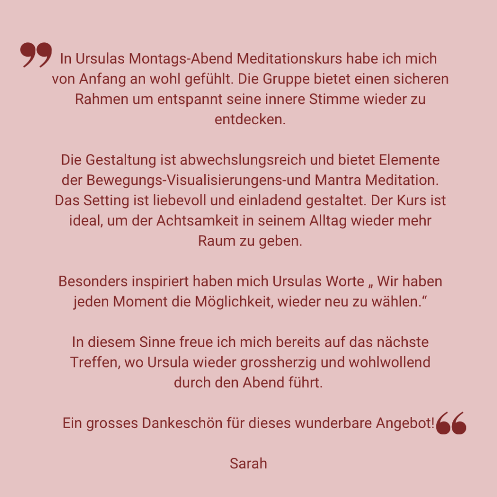 Genau dies und noch vieles mehr üben wir in den Meditationen, greifen aber auch Alltagsthemen auf, reflektieren sie in den Meditationen, um dadurch mehr Gelassenheit in den Alltag holen zu können und widmen uns einer entspannten Atmung.