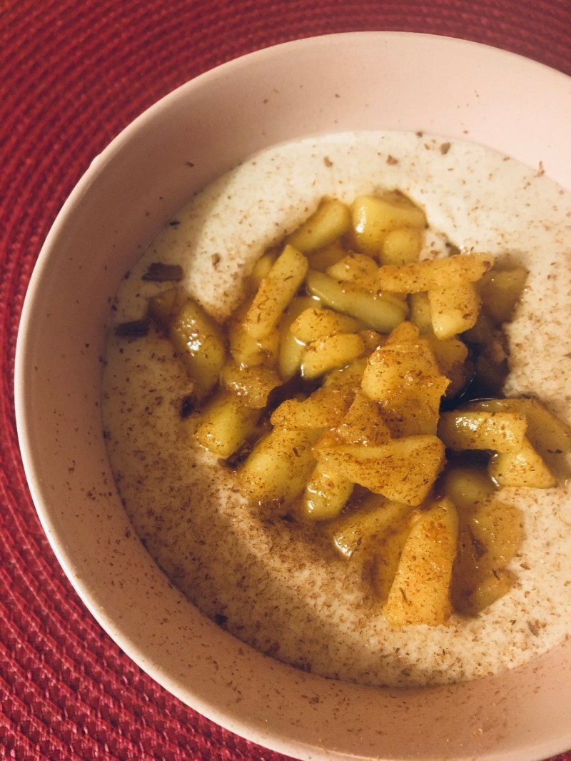 Für 1 Person 2 EL Weizen- oder Dinkelgriess, 1 Zimtstange, 1 Messerspitze Kardamom, gemahlen 1 Messerspitze Kurkuma 1 Spritzer frischer Zitronensaft 🍋 1 Mittlere Apfel, geschält Mandelmilch Ahornsirup 1 TL Ghee Eine leckere, besonders wärmende und erdende Frühstücks- oder Abendessenvariante, ideal für kühle Wintertage: Den Apfel, vierteln und in kleine Stücke schneiden. Den Ghee in…